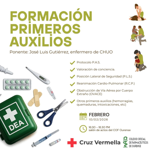 Estamos seguros de que saber actuar en caso de emergencia es fundamental porque los Primeros Auxilios salvan vidas. Por ello, el Colegio Oficial de Farmacéuticos de Ourense, en colaboración con Cruz Roja ha organizado una charla informativa de una duración estimada de 2 horas para repasar conceptos básicos para una buena actuación sanitaria ante una urgencia sanitaria.